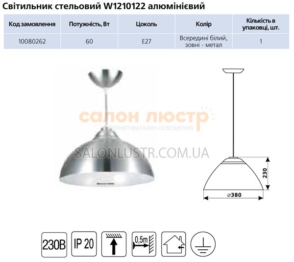 - УКРАЇНАВисота: 15 см; ширина: 13,5 см; лампи: 1 х Е-27 х 60 Вт.