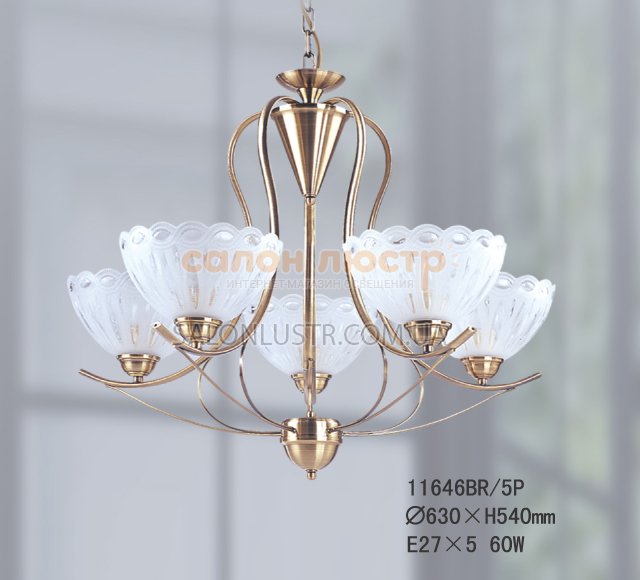 Люстра класична виробництва компанії Tinko; Матеріал: метал, скло; Колір підстави: бронза; Колір плафона: білий матовий із прозорим малюнком; Висота: 60-75 см; діаметр: 63 см; лампи: 5 х Е-27 х 60 Вт.