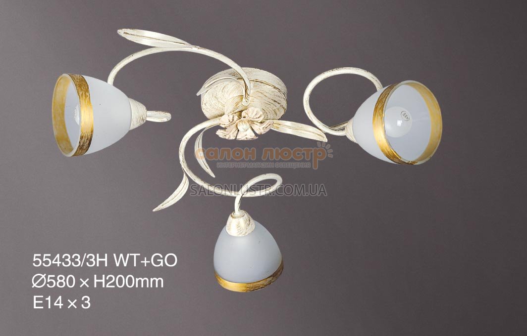 Люстра пристільна виробництва компанії Tinko; Матеріал: метал, скло; Колір підстави: бежеве із золотою патиною; Колір плафона: білий матовий із золотою патиною; Висота: 20 см; діаметр: 58 см; лампи: 3 х Е-14 х 60 Вт.
