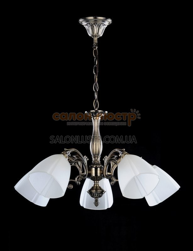 Люстра класична виробництва компанії TINKO; Матеріал: метал, колір: бронза; Плафон: стекло, колір: білий; Висота: 36 см; діаметр: 62 см; лампи: 5 х Е27 х 60 Вт.