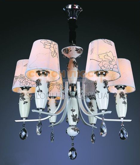 Люстра класична виробництва компанії Tinko; Матеріал: метал/стекло; колір: хром/білий з малюнком; Плафон: текстиль, колір: бежевий з малюнком; Декоративний елемент: прозорий кришталь; Висота: 73 см; діаметр: 73 см; лампи: 6 х Е-14 х 60 Вт; кріплення: на гак.