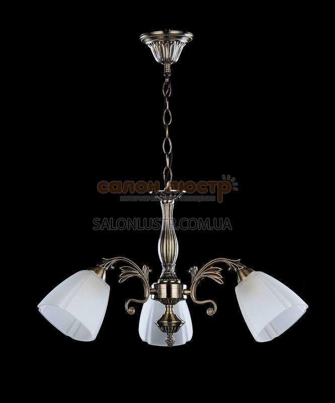 Люстра класична виробництва компанії TINKO; Матеріал: метал, колір: бронза; Плафон: стекло, колір: білий; Висота: 36 см; діаметр: 62 см; лампи: 3 х Е27 х 60 Вт.