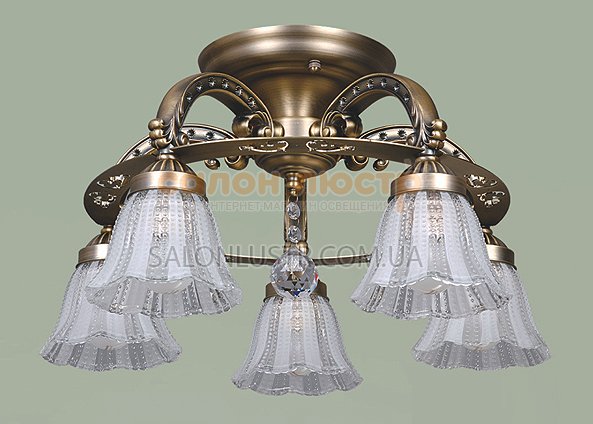 Люстра пристільна виробництва компанії Tinko; Матеріал: метал,скло, кришталь; Колір підстави: бронза; Колір плафона: прозорий+матовий; Декоративний елемент: прозорий кришталь; Висота: 26 см; діаметр: 45 см; лампи: 5 х Е-27 х 60 Вт.