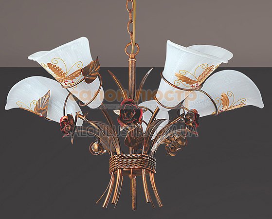 Люстра класична виробництва компанії Tinko; Матеріал: метал, скло; Колір основи: мідь із патиною; Колір плафонів: білий з малюнком; Висота: 50-80 см; діаметр: 65 см; лампи: 5 х Е-14 х 60 Вт.