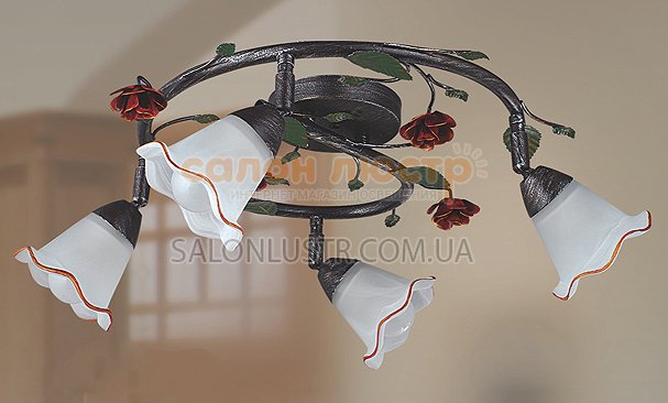 Люстра пристільна виробництва компанії Tinko; Матеріал : метал, скло; Колір підстави: чорне зі срібною патиною +зелений + червоний; Колір плафона: білий з мармуровим малюнком; Плафон обертається на шарнірі; Висота: 18 см; довжина: 53 см; ширина: 40 см; лампи: 4 х Е-14 х 60 Вт.