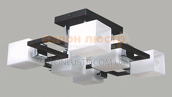 Люстра стельова виробництва компанії TINKO; Матеріал: метал, скло; Колір підстави: хром+чорний; Колір плафона: білий; Висота: 18 см; довжина: 50 см; ширина: 38 см; лампи: 6 х Е14 х 60 Вт.
