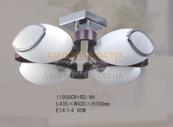 Люстра сучасна виробництва компанії TINKO; Матеріал: метал, скло; Колір основи: хром+бордо; Колір плафонів: білий+хром; Висота: 15 см; ширина: 43,5 х 43,5 см; лампи: 4 х Е14 х 60 Вт.