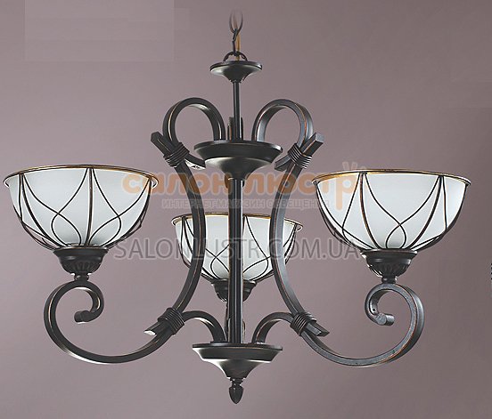Люстра класична виробництва компанії TINKO; Матеріал: метал, скло; Колір підстави: чорний з мідною патиною; Колір плафона: білий матовий; Висота: 55-90 см; діаметр: 67 см; лампи: 3 х Е27 х 60 Вт.