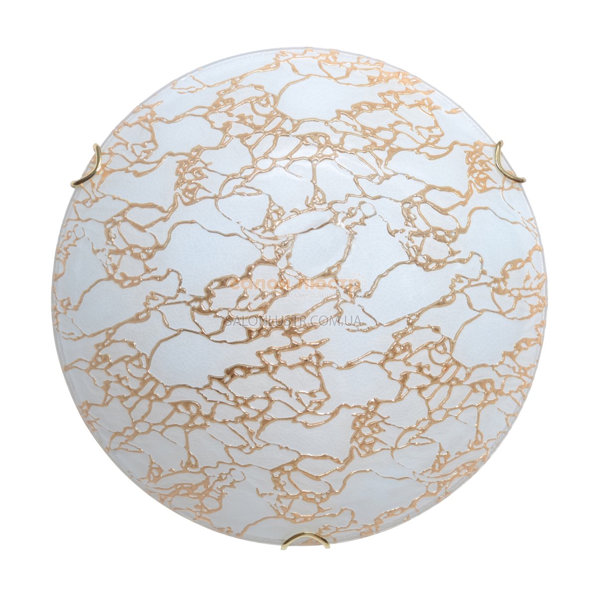 Світильник стельовий, настінний виробництва компанії Декора (Україна); Матеріал: метал, скло; Колір: білий/золото з малюнком; Висота: 8 см; діаметр: 40 см; лампи: 3 х E27 х 60 Вт.