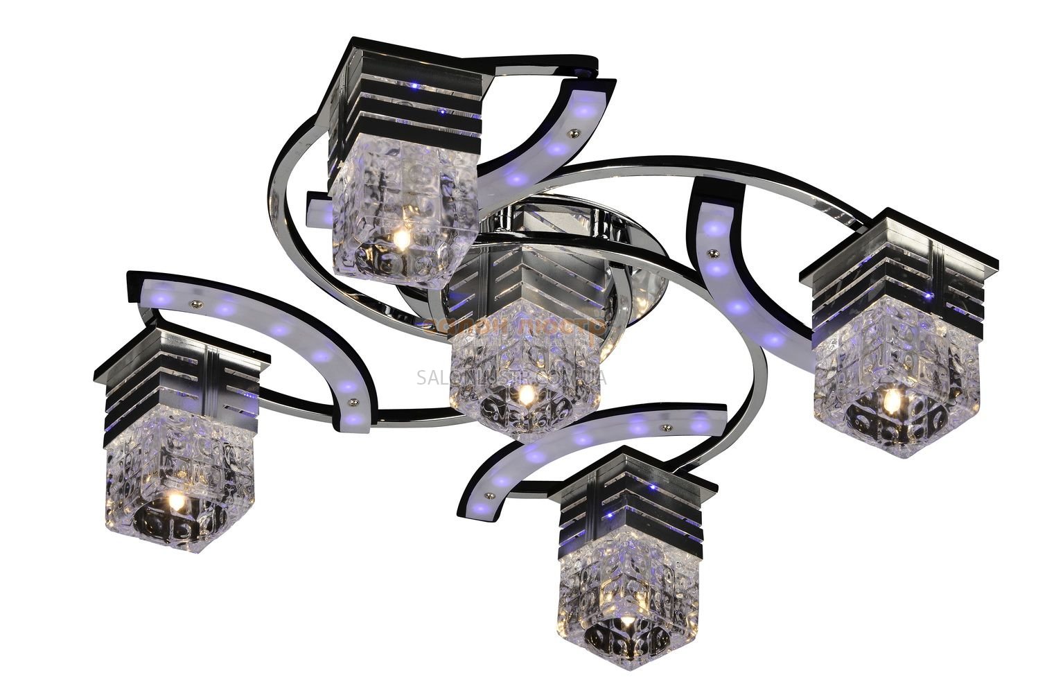 Люстра стельова виробництва компанії "BLITZ" (Німеччина); Матеріал: метал, стекло, полімер; Колір підстави: хром; Колір плафонів: прозорий; Висота: 18 см діаметр: 62 см лампи: 5 х G4 х 20 Вт + 44 LED х 0.05W.