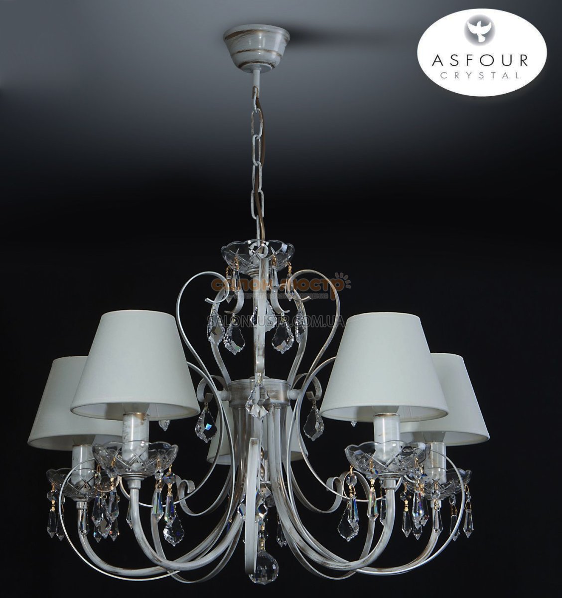 Люстра з абажурами й кришталем виробництва Україна; Матеріал: фарбований метал, полімер, текстиль, кришталь"ASFOUR"; Колір основи: Білий - золото - патина; Номер абажура: 67N; Колір тканини абажура: 0205; Висота: 60-75 см; ширина: 68 см; лампи: 5 х Е-14 х 60 Вт.