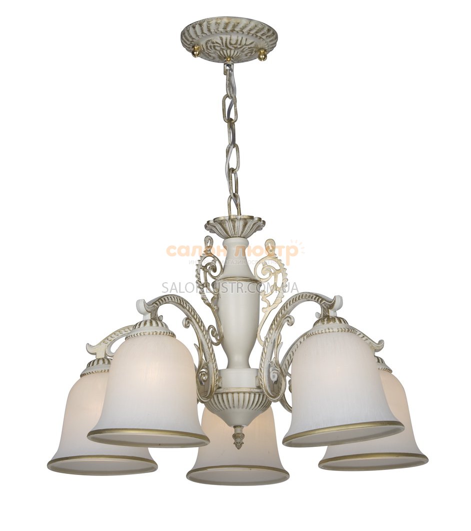 Люстра класична виробництва компанії "BLITZ" (Німеччина); Матеріал: метал, скло; Колір підстави: білий із золотою патиною; Колір плафона: білий матовий + золото; Висота: 50-60 см; ширина: 56, см лампи: 5 х E27 х 60 Вт.