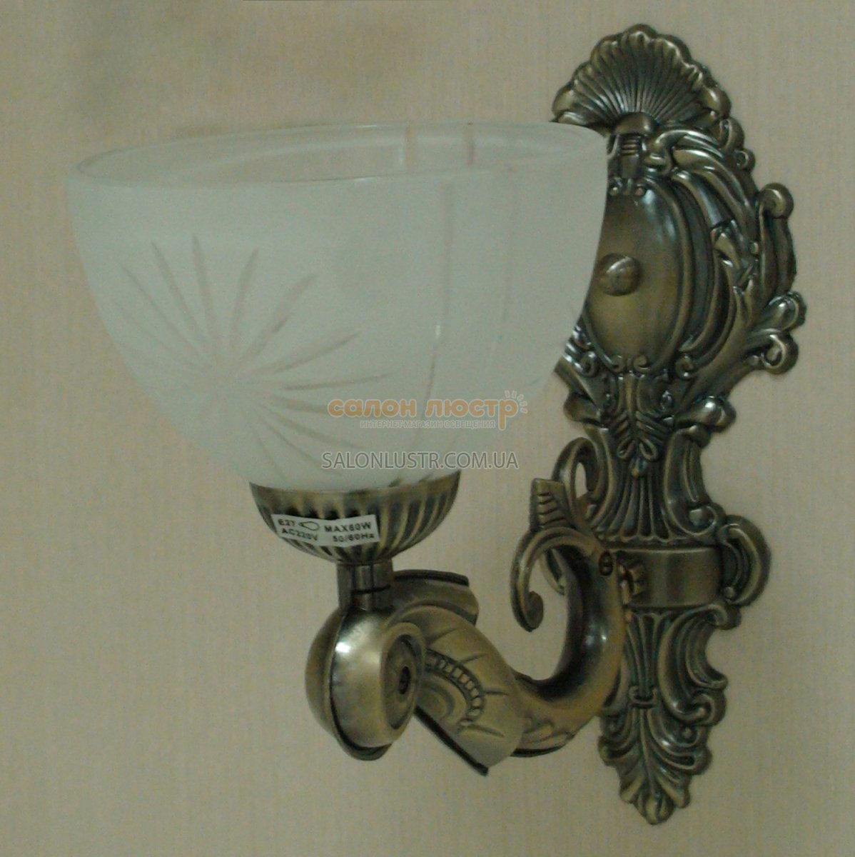 Бра виробництва компанії TINKO; Матеріал: метал, скло; Колір підстави: бронза з патиною; Колір плафона: матовий із прозорим малюнком; Висота: 26 см; ширина: 15 см лампи: 1 х Е27 х 60 Вт.