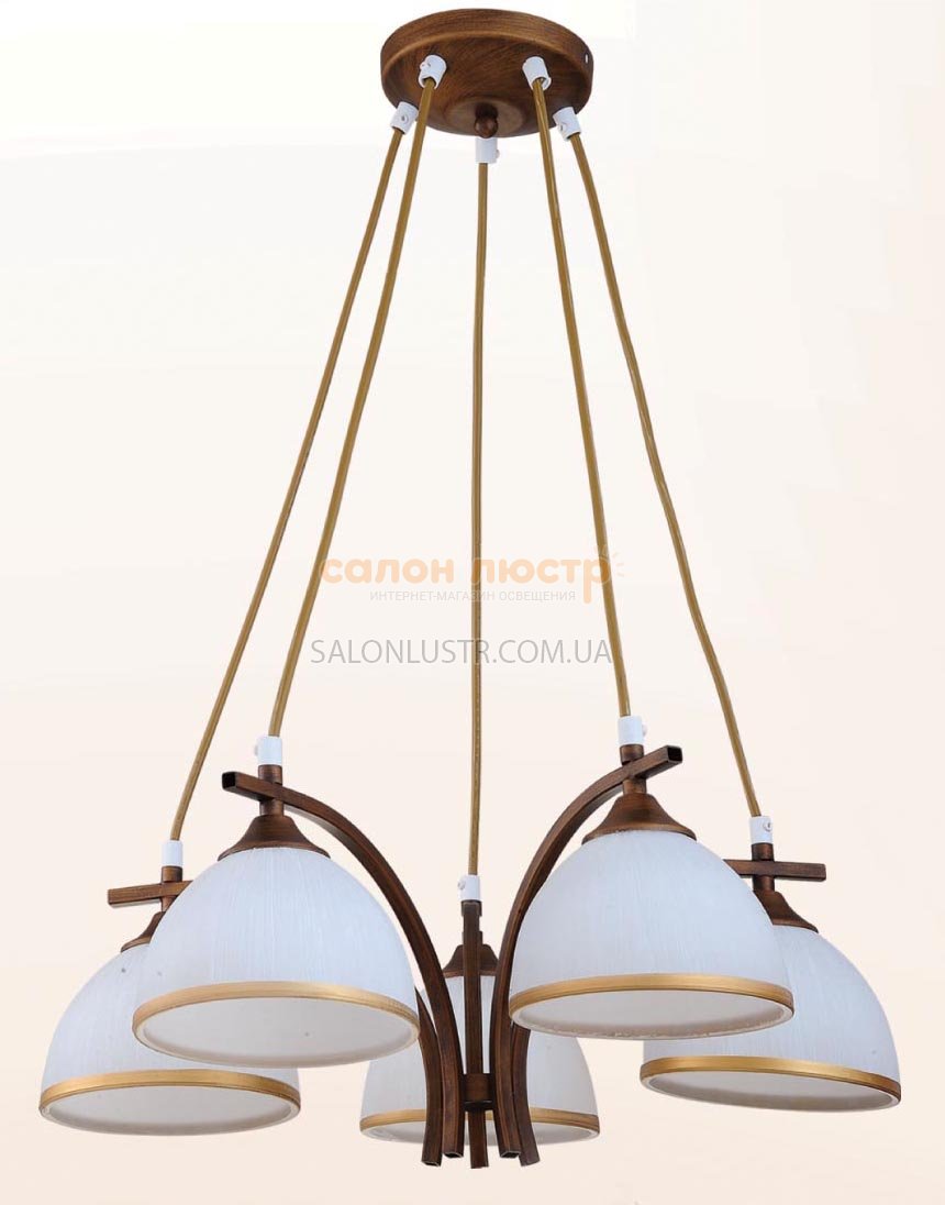 Люстра підвіс виробництва компанії Tinko; Матеріал: метал, скло; Колір основи: антична мідь; Колір плафона: білий матовий із золотим декором; Висота: 40-80 см; діаметр: 49 см; лампи: 5 х Е-27 х 60 Вт.