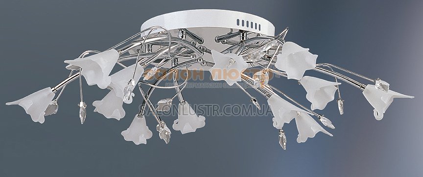 Люстра галогенна виробництва компанії TINKO; Матеріал: метал, скло; Колір основи: хром; Колір плафона: матовий; Висота: 19 см; діаметр: 70 см; лампи: 12 х G4 12V 20W; Лампочки в комплекті; Пульт дистанційного керування в комплекті.