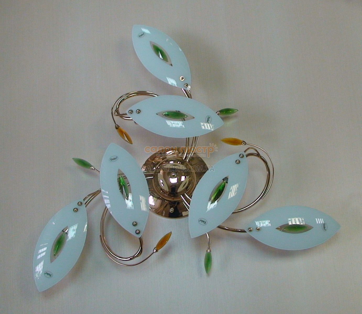 Люстра пристільна виробництва компанії Tinko; Матеріал: метал, скло; Колір підстави: золото; Колір плафона: білий; Декоративний елемент: зелений+коричневий кришталики; Висота: 19 см; діаметр: 82 см; лампи: 6 х Е-14 х 60 Вт.