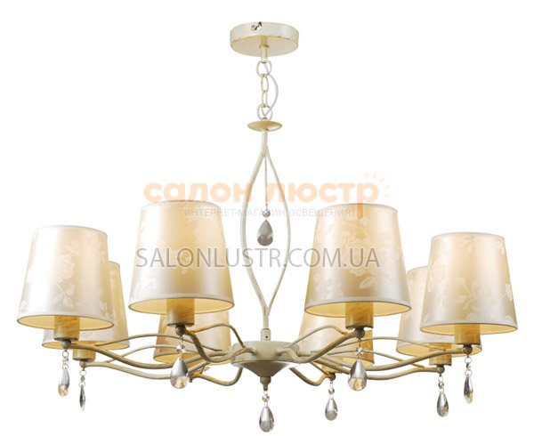 Люстра класична з абажурами виробництва компанії BLITZ(Німеччина); Матеріал: метал, текстиль; Колір підстави: крем+золото; Колір абажурів: бежевий з малюнком; Висота: 58 см; ширина: 88 см лампи: 8 х E27 х 40 Вт.