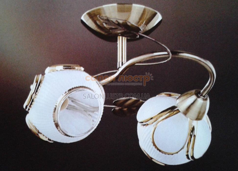 Люстра пристільна виробництва компанії Tinko; Матеріал: метал, скло; Колір підстави: бронза; Колір плафона: білий+золото; Висота: 20 см; діаметр: 36х33 см; лампи: 2 х Е-14 х 60 Вт.
