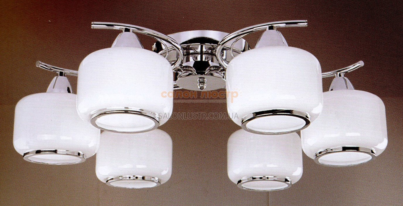 Люстра стельова виробництва компанії TINKO; Матеріал: метал, скло; Колір підстави: хром; Колір плафона: білий глянсовий; Діаметр: 58 см; висота: 20 см; лампи: 6 х Е27 х 60 Вт.