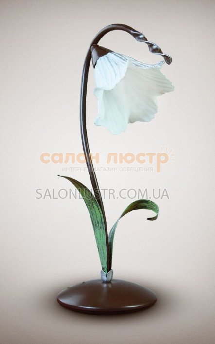 Настільна лампа виробництва Україна; Матеріал: фарбований метал (ручний розпис), декоративний плафон; Колір основи: коричнево-зелено-срібний; Колір плафонів: Каліфорнія біло-срібна; Висота: 44 см; діаметр: 22 см; лампи: 1 х Е-14 х 60 Вт.