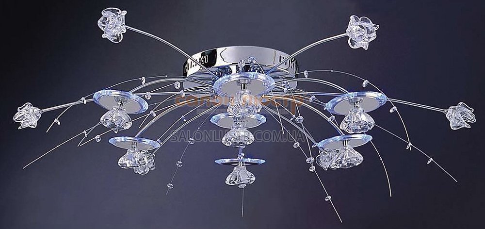 Люстра галогенна виробництва компанії Tinko; Матеріали: метал, скло; Колір підстави: хром, золото; Колір плафонів: прозорий; Висота: 21 см; діаметр: 102 см; лампи: 17 х G4 12V 20W; Декоративний елемент: прозорий кришталь, діоди LED. Лампочки в комплекті.