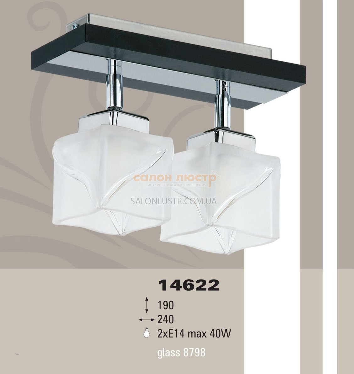 Висота: 19 см; довжина: 24 см; лампи: 2 х Е14 х 40 Вт.