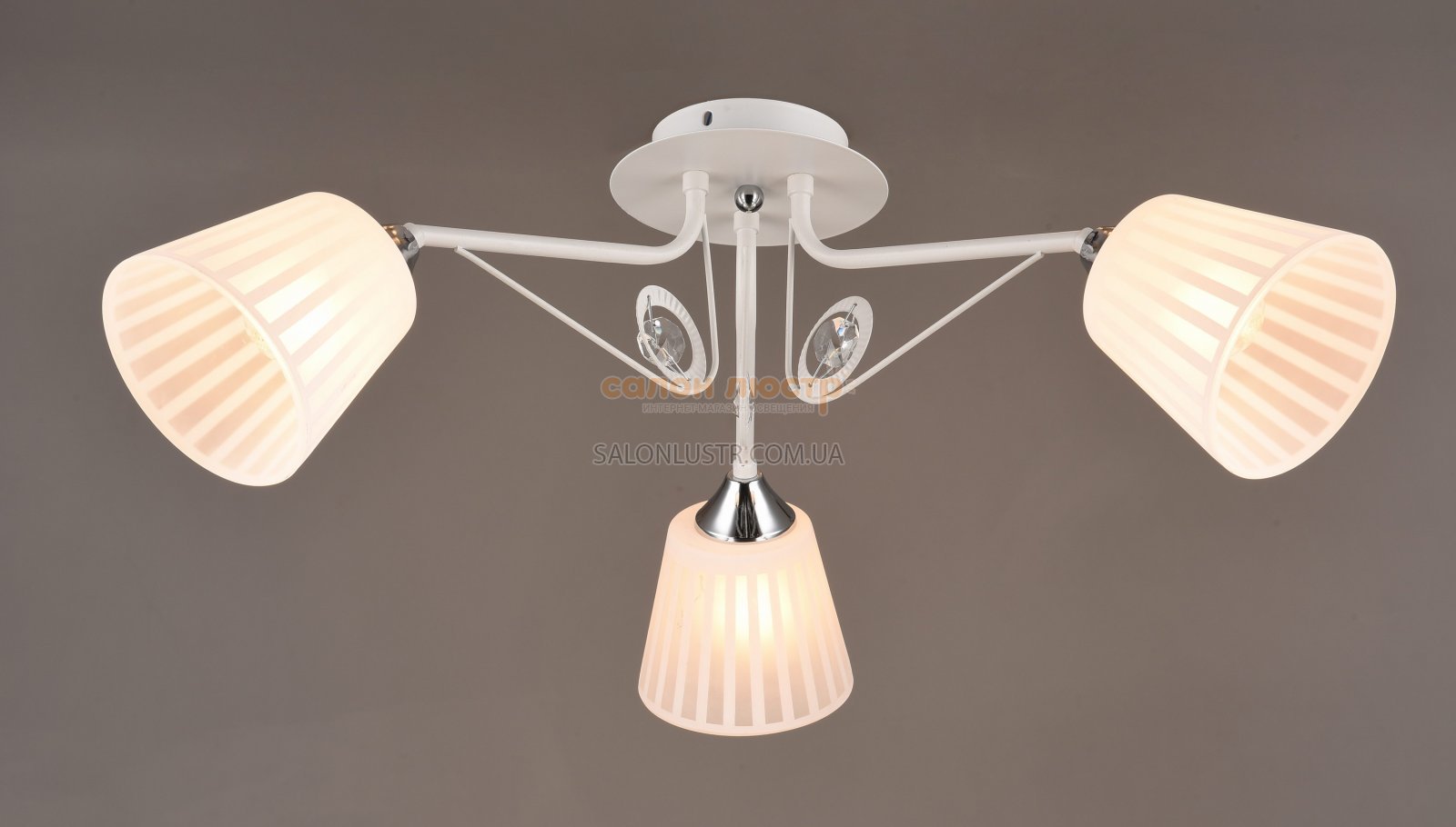 Люстра стельова виробництва компанії Sirius; Матеріал: метал, скло; Колір підстави: білий+хром; Колір плафона: білий з малюнком; Висота: 25 см; ширина: 65 см; лампи: 3 х Е27 х 60 Вт.