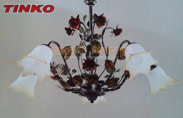 Люстра флористика виробництва компанії Tinko; Матеріал: метал, скло; Колір основи: чорний антик+зелений+червоний; Колір плафона: білий+жовтий; Висота: 50-80 см; діаметр: 65 см; лампи: 5 х Е-14 х 60 Вт.