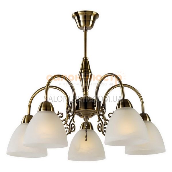 Люстра класична виробництва компанії "BLITZ" (Німеччина); Матеріал: метал, скло; Колір підстави: бронза; Колір плафона: білий з мармуровим малюнком; Висота: 46 см; ширина: 52 см; лампи: 5 х Е-27 х 60 Вт.