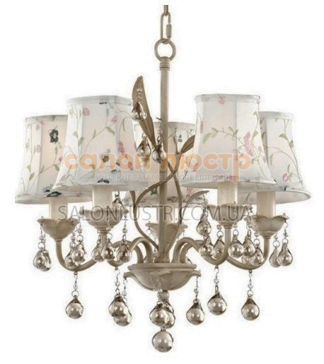 Люстра класична з абажурами серії Cinderella виробництва компанії "Wunderlicht" (Німеччина); Матеріал: метал, текстиль, скло; Колір підстави: крем із золотою патиною; Колір абажура: білий з малюнком; Висота: 49-80 см; ширина: 50 см; лампи: 5 х Е-14 х 60 Вт.