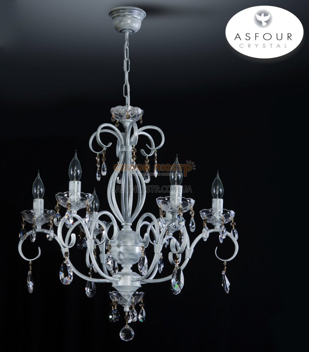 Люстра кришталева виробництва Україна; Матеріал: фарбований метал,кришталь"ASFOUR"; Колір основи: Білий - срібло - патина; Висота: 82-97 см; ширина: 57 см; лампи: 6 х Е-14 х 60 Вт.