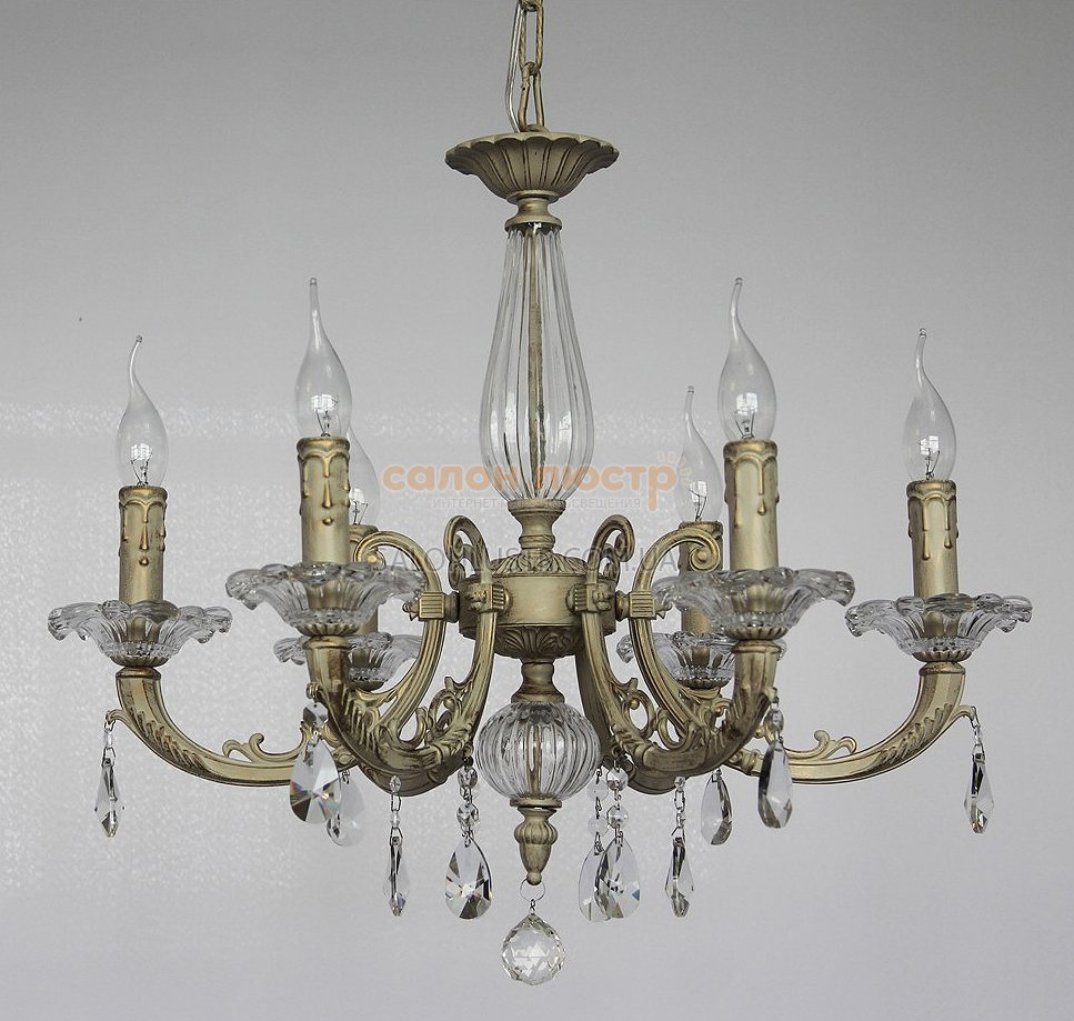 Люстра класична серії Skone виробництва компанії " Wunderlicht" (Німеччина); Матеріал: метал / кришталь / стекло; Колір: бежевий із золотою патиною / прозорий / прозоре; Висота: 53-80 см; ширина: 63 см; лампи: 6 х E14 х 60 Вт.