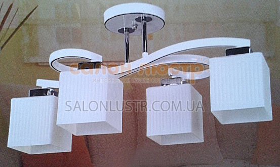 Люстра стельова виробництва компанії Tinko; Матеріали: метал, скло; Колір (підстави): білий+хром; Колір (плафонів): білий матовий; Тип кріплення: на планку; Висота: 29 см; ширина: 38 см; довжина: 54см; лампи: 4 х Е-27 х 60 Вт.
