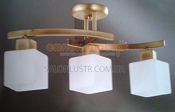 Люстра стельова виробництва компанії Tinko; Матеріали: метал, скло; Колір (підстави): матове золото; Колір (плафонів): білий матовий; Тип кріплення: на планку; Висота: 24 см; ширина: 18 см; довжина: 55 см; лампи: 3 х Е-27 х 60 Вт.