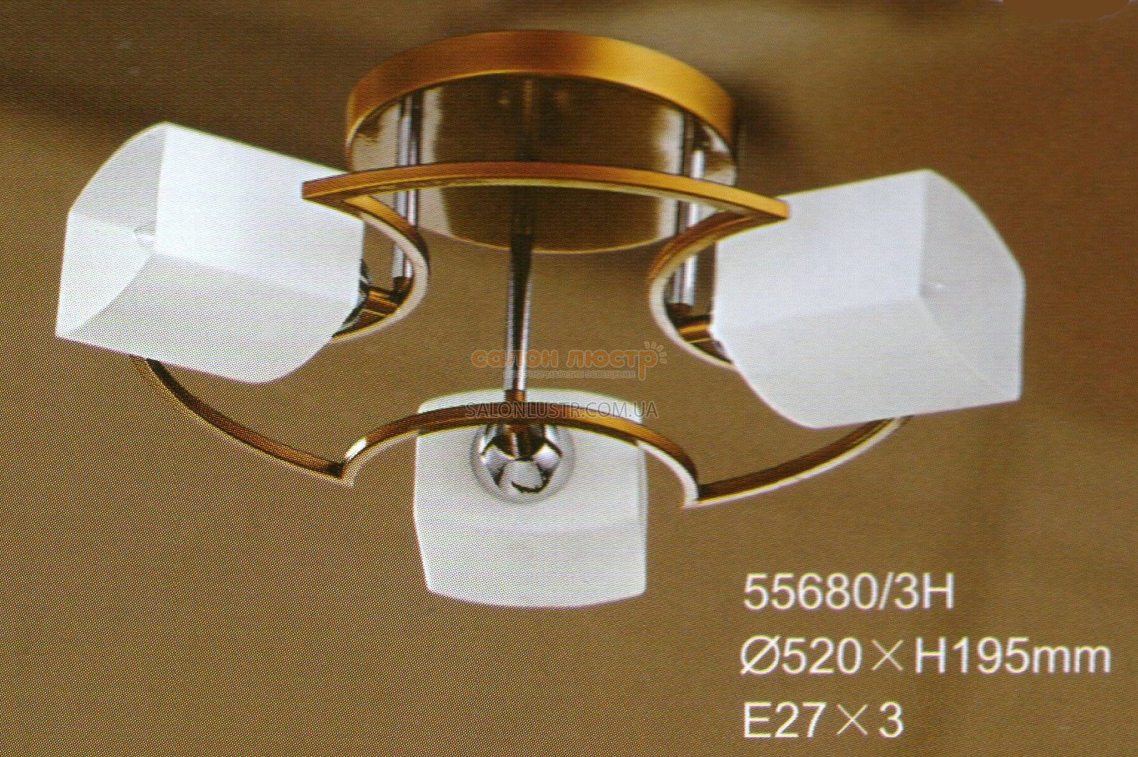 Люстра пристільна виробництва компанії Tinko; Матеріал: метав, стекло; Колір підстави: матове золото+хром; Колір плафона: білий; Висота: 19,5 см; діаметр: 52 см; лампи: 3 х Е-27 х 60 Вт.