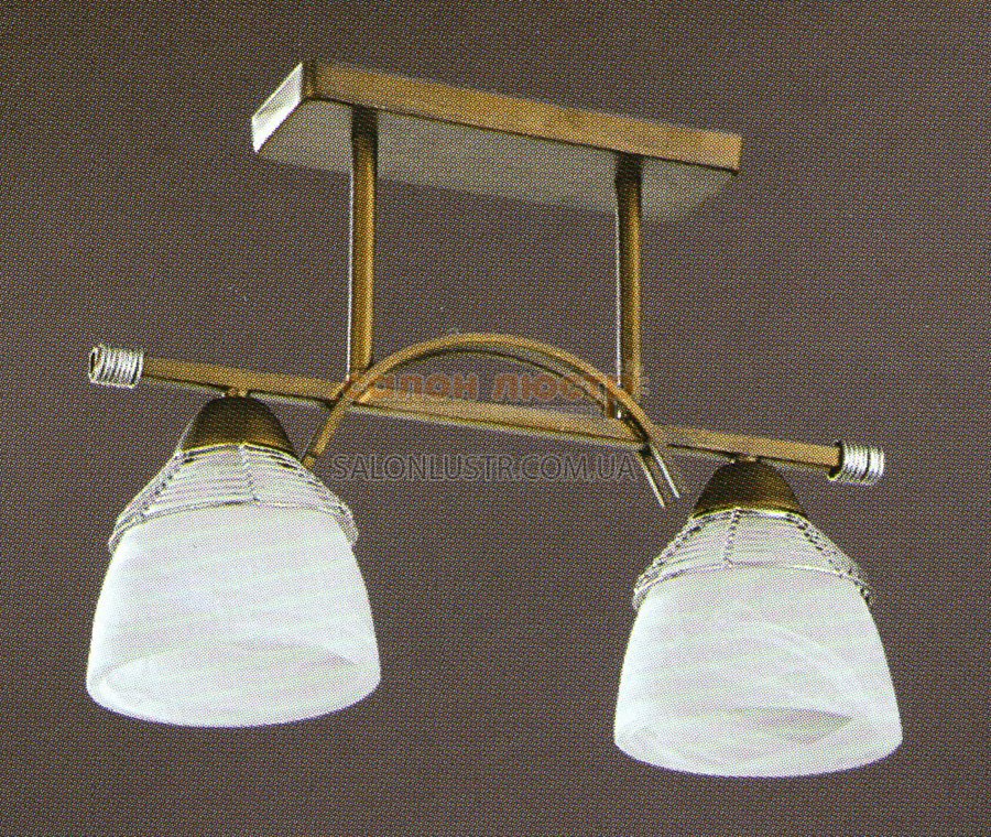 Люстра стельова виробництва компанії Tinko; Матеріал: метал, скло; Колір основи: стара бронза+хром; Колір плафона: білий з мармуровим малюнком; Висота: 29 см; довжина: 44 см; ширина: 18 см; лампи: 2 х Е-27 х 60 Вт.
