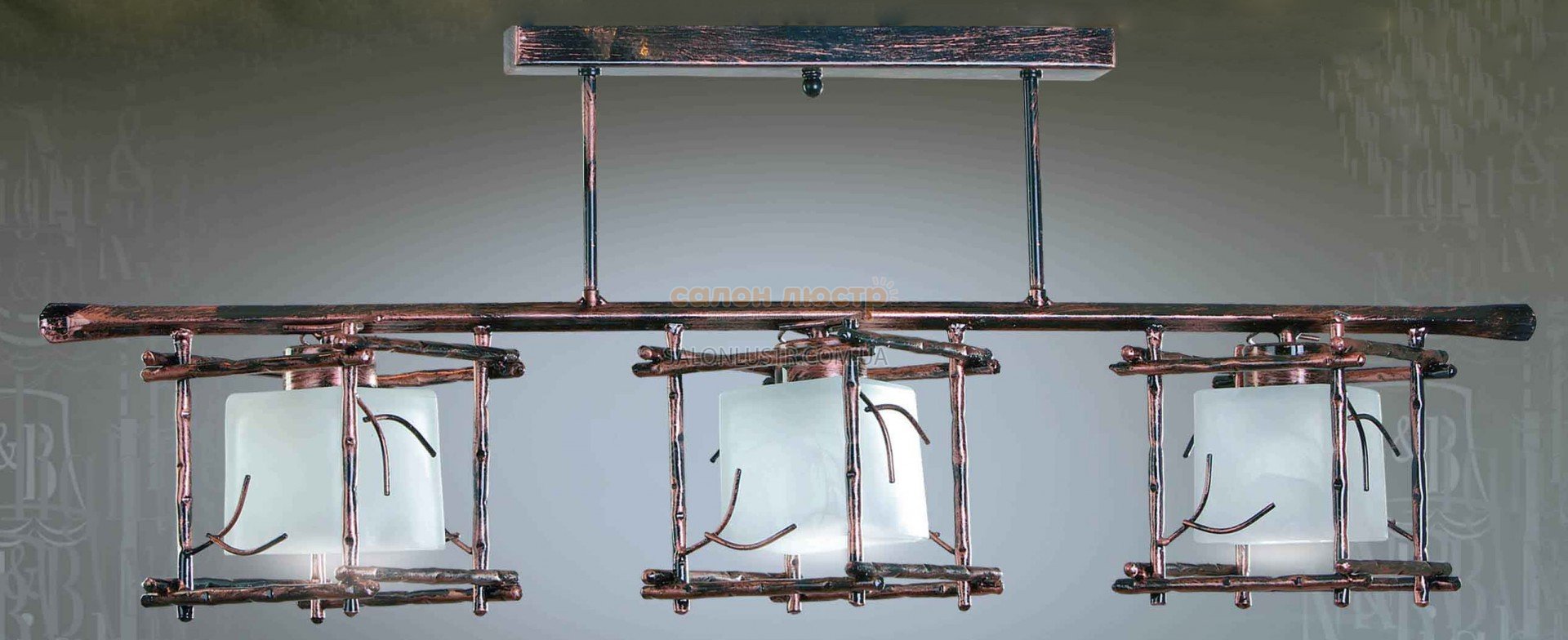 Люстра стельова виробництва компанії Україна; Матеріал: фарбований метал, скляний плафон; Колір підстави: Чорний - мідь; Плафон: Квадро середнє; Колір плафона: Білий; Висота: 37 см; довжина: 100 см; лампи: 3 х Е-27 х 60 Вт.