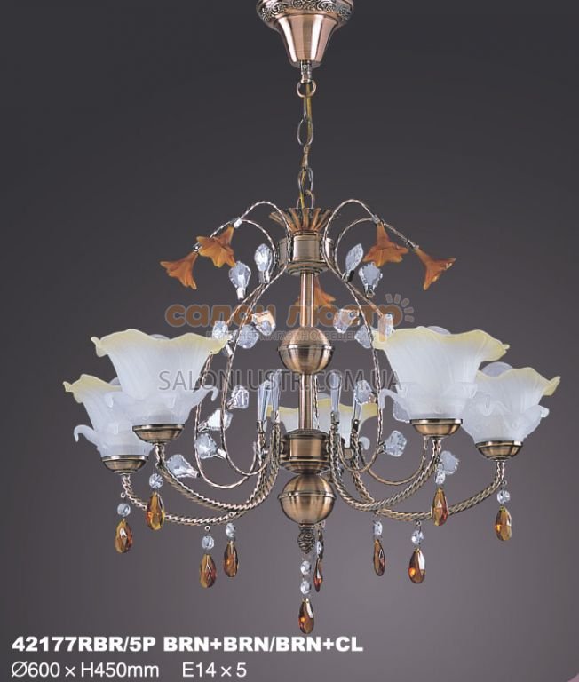 Люстра флористика виробництва компанії "TINKO"; Матеріал: метал, скло, полімер; Колір основи: мідь із патиною; Колір плафонів: білий+бежевий; Декоративний елемент: прозоре й кольорове скло, полімер; Висота: 55 см; діаметр: 60 см; лампи: 5 х Е-14 х 60 Вт.