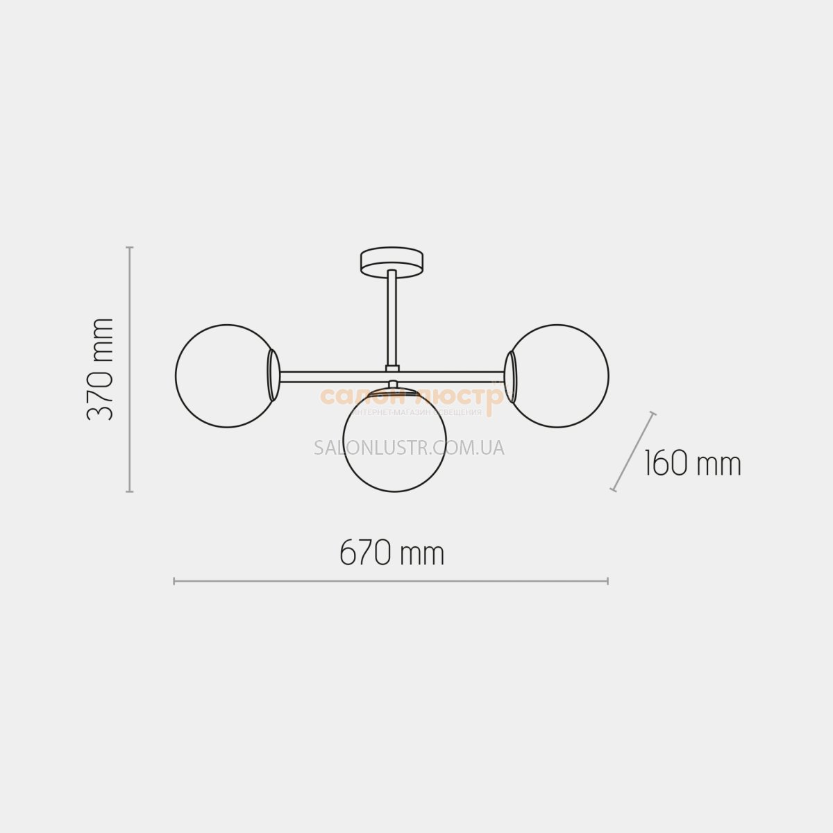 Висота: 37 см; ширина: 67 см; лампи: 3 х Е27 х 60 Вт.