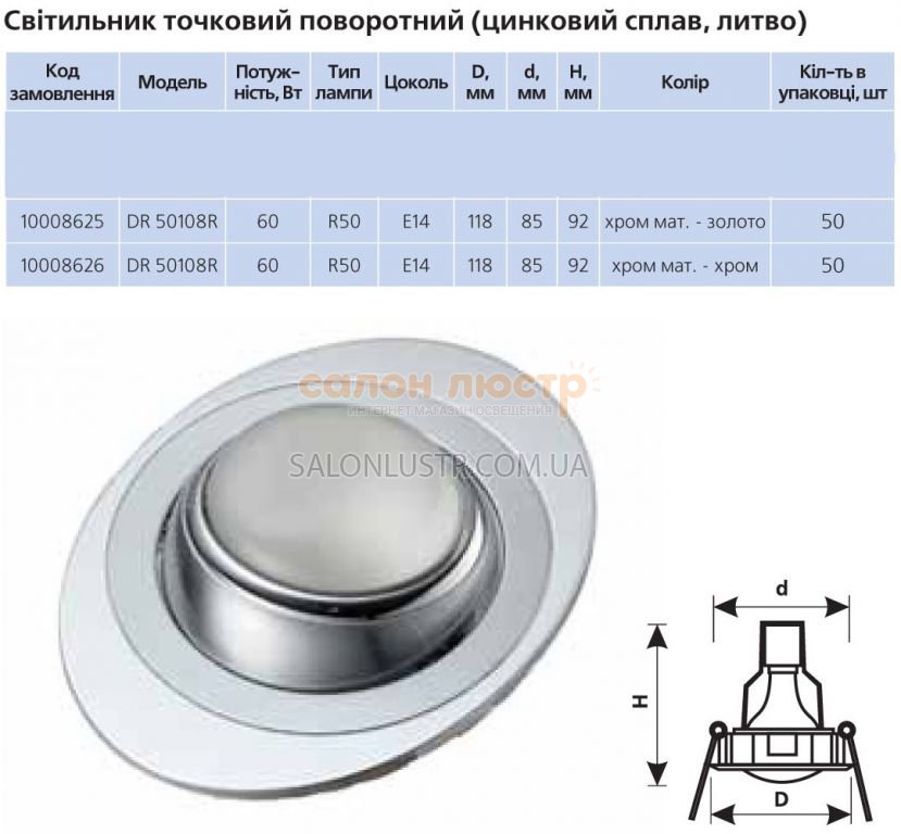 Крапковий світильник поворотний виробництва компанії DELUX. Матеріал: метал(цинковий сплав,лиття). Колір: матовий хром+золото. Висота: 9,2 см; діаметр: 11,8 см; лампи: 1рефлекторна лампа R50,цоколь Е14;напруга:230В;потужність: 60Вт,40Вт. Також, можливо використовувати енергозберігаючі лампочки EXR 50 9Вт, приблизно рівної потужності 45Вт лампи розжарювання або EXR 50 7Вт, приблизно рівної потужності 35Вт лампи розжарювання або EXR 50 5Вт,рівної 25Вт.