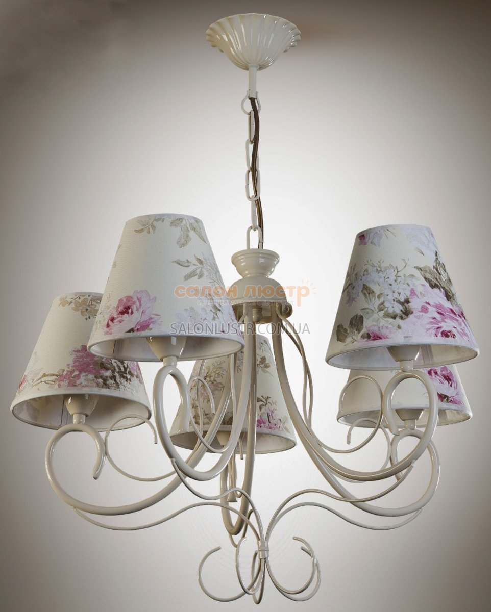Люстра класична з абажурами виробництва Україна; Матеріал: метал, полімер, текстиль; Колір основи: Крем; Номер абажура: 01N; Колір тканини абажура: 0504; Висота: 60-72 см; ширина: 57 см; лампи: 5 х Е-14 х 60 Вт.