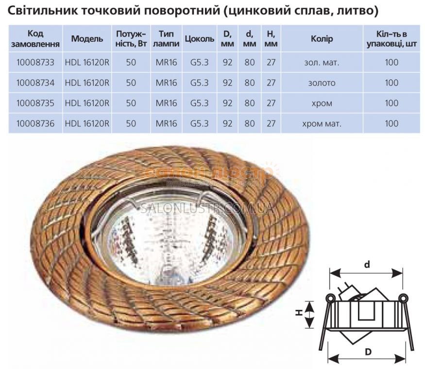 Крапковий світильник поворотний виробництва компанії DELUX. Матеріал: метав(цинковий сплав,лиття). Колір: золото,матове золото,хром,матовий хром. Висота: 2,7 см; діаметр:9,2 см; лампи: 1галогенна лампа MR16,цоколь G5,3;напруга: 12В/230В;потужність: 50Вт,35Вт,20Вт. Для лампочок 12В потрібний трансформатор або кілька трансформаторів, потужністю не менше сумарної потужності всіх лампочок. Також можливо використовувати енергозберігаючі лампочки EMR 16 9ВТ приблизно рівної потужності 40Вт лампи розжарювання.
